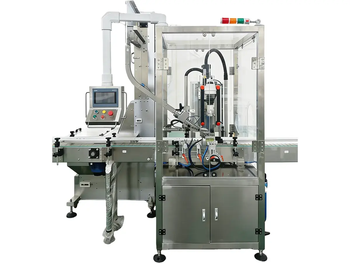 La tappatrice automatica a testa singola è caratterizzata da un design compatto e un'elevata efficienza produttiva, ideale per l'applicazione di tappi in plastica e metallo con alta precisione e affidabilità. Grazie al sistema di serraggio pneumatico bilanciato, applica una pressione uniforme durante la chiusura dei tappi, garantendo sigillature stabili e costanti. Questa configurazione rende la tappatrice compatibile con una vasta gamma di bottiglie, tra cui PET, PP, PVC, HDPE, LDPE e vetro.